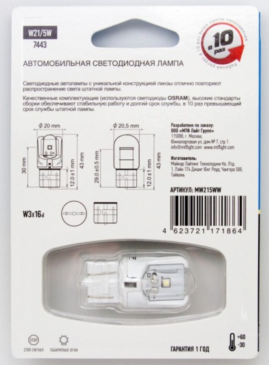Светодиодная лампа MTF Light W21/5W 2.6/0.6W с уникальной конструкцией линзы отлично повторяет распространение света штатной лампы. Цвет свечения автолампы: красный.