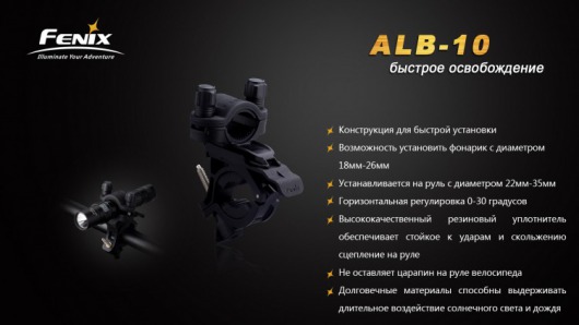 Надежность использованных материалов, практичность конструкции и широкий диапазон регулировки обеспечивают велосипедному креплению Fenix ALB-10 заслуженную популярность среди покупателей в разных странах мира.