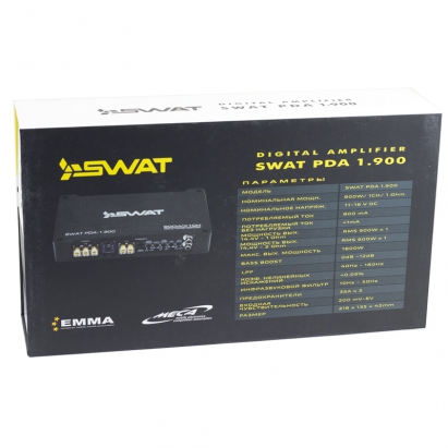 Swat PDA-1.900 позиционируется как одноканальный сабвуферный автоусилитель класса D. Соединения и элементы управления расположены вдоль одной стороны усилителя, что особенно порадует установщиков. Усилитель оснащён всеми элементами управления, необходимыми для настройки сабвуфера.