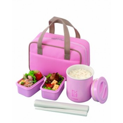 Наборы для обедов с термосумкой. В комплекте: цилиндрическая, герметично закрывающаяся пластиковая емкость, которая вставляется в термоконтейнер из нержавеющей стали, а также 2 пластиковых контейнера и палочками в пенале, и все это помещается в удобной компактной термосумке.
