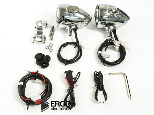 Акустика для мотоцикла Ergo ER500M - это 2 динамика 3 дюйма высочайшего качества в металлическом литом корпусе со встроенным усилителем и интерфейсами подключения Bluetooth, USB, AUX IN защищенные от пыли и влаги по классу IP65 + необходимый крепеж для установки на руль и проводка.