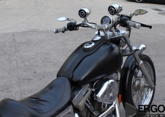 В один из динамиков встроен усилитель мощностью 2x80Вт, что очень удобно и снимает проблему с размещением отдельного усилителя на мотоцикле.