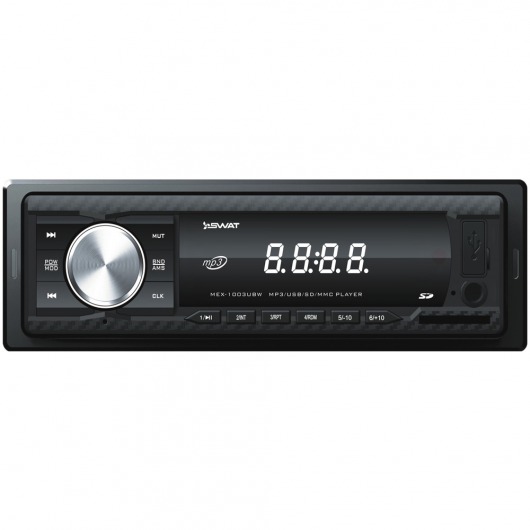 Автомобильная магнитола 1din Swat MEX-1003UBW – недорогое, но функциональное утройство. У MEX-1003UBW есть широкий набор мультимедийных технологий, которые позволяют выжать из устройства по максимуму. Ресивер способен выдавать звук на 2 колонки по 35 ватт. Есть возможность сохранения до 18 радиостанций на цифровом радио-тюнере. Кроме того, реализована возможность прослушивания аудиозаписей через карту памяти.