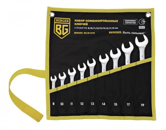 BERGER BG-09SCW — это набор комбинированных гаечных ключей, состоящий из 9 инструментов  – от 8 до 19 мм. Комбинированные ключи BERGER BG-09SCW хранятся в удобном чехле, в котором все ключи расположены строго по размеру.