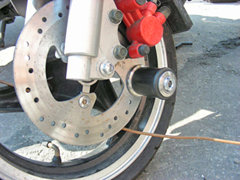 • При блокировании лучше всего располагать замок чуть ниже тормозного суппорта мотоцикла по ходу вращения колеса против часовой стрелки.