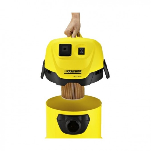 Хозяйственный пылесос Karcher WD 3.500 P подходит для сухой и влажной уборки. Благодаря патронному фильтру можно чередовать сбор жидкости или сухого мусора, не меняя фильтры. На корпусе пылесоса есть специальный крючок, чтобы Вы смогли аккуратно хранить сетевой кабель.