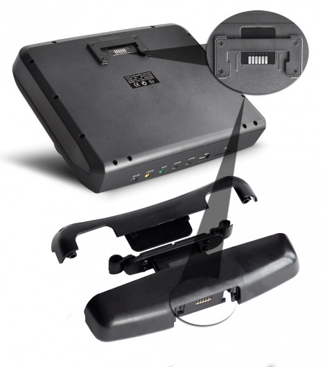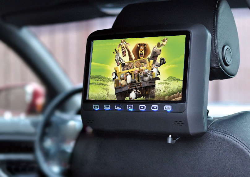 Управление и настройка прибора осуществляется при помощи сенсорных кнопок и пульта дистанционного управления. Этот монитор устанавливается на подголовник за счет специального кронштейна, который имеет возможность регулировки расстояния между креплениями (от 12 до 18 см), что обеспечивает надежную фиксацию на опорах штатного подголовника. В комплект поставки входит особый набор для крепления монитора на ножки, диаметр которых 10, 12 и 14 мм.