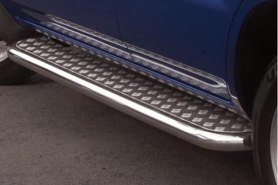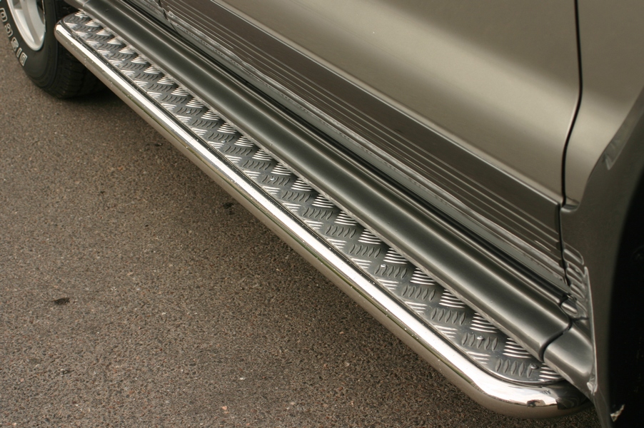 Боковые пороги на Nissan X-Trail из нержавеющей стали диаметром 76 мм не боятся коррозии, сколов и царапин и выдерживают большие нагрузки. Боковые подножки-пороги с проступями сделаны специально для автомобилей Nissan X-Trail от 2011 г.в., легко устанавливаются и стильно смотрятся. В комплекте вы получите 2 подножки.